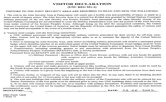 The next morning, we go to the tour agency on the 3rd floor of the Lotte Hotel to join the tour known as the Paju and Panmunjeom trip to the North Korean border. As we are not allowed to go this region individually, we are obliged to go to that place with a tour group. Before we join the tour, they warn us in many ways. We are warned of not wearing strappy, lap, transparent, resembling military clothes, and open shoes because they are all forbidden. It is also prohibited making mimic and gesture and sudden movement, and when we go there they make us sign a paper on that nobody is responsible for anything that will happen.